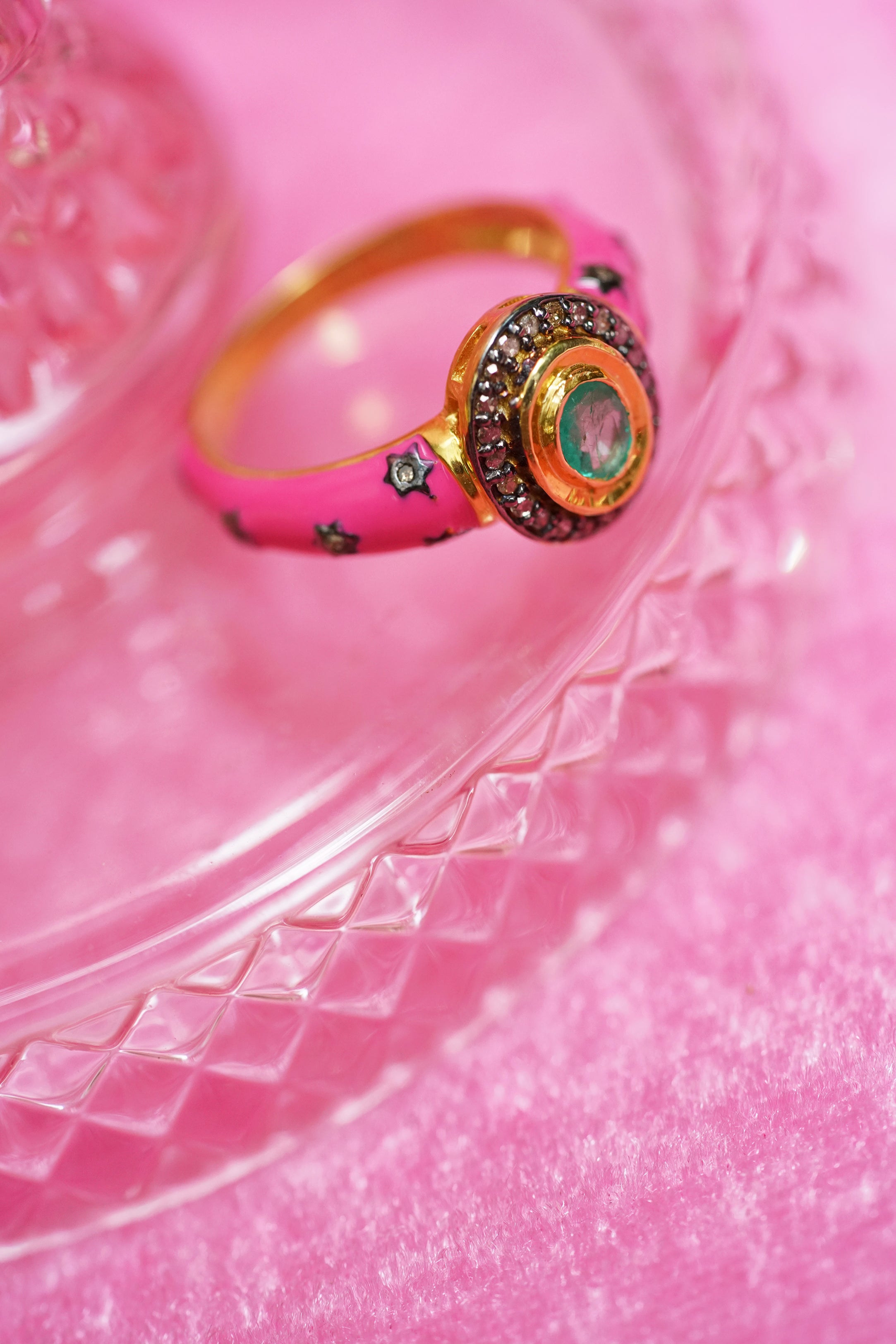La bague Nela est en laiton plaqué or, email fuchsia ornée d'émeraude.