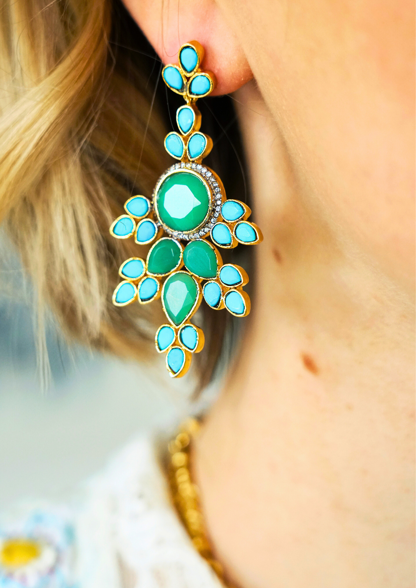 Boucles d'oreilles plaquées or, ornées de turquoise et chysoprase.