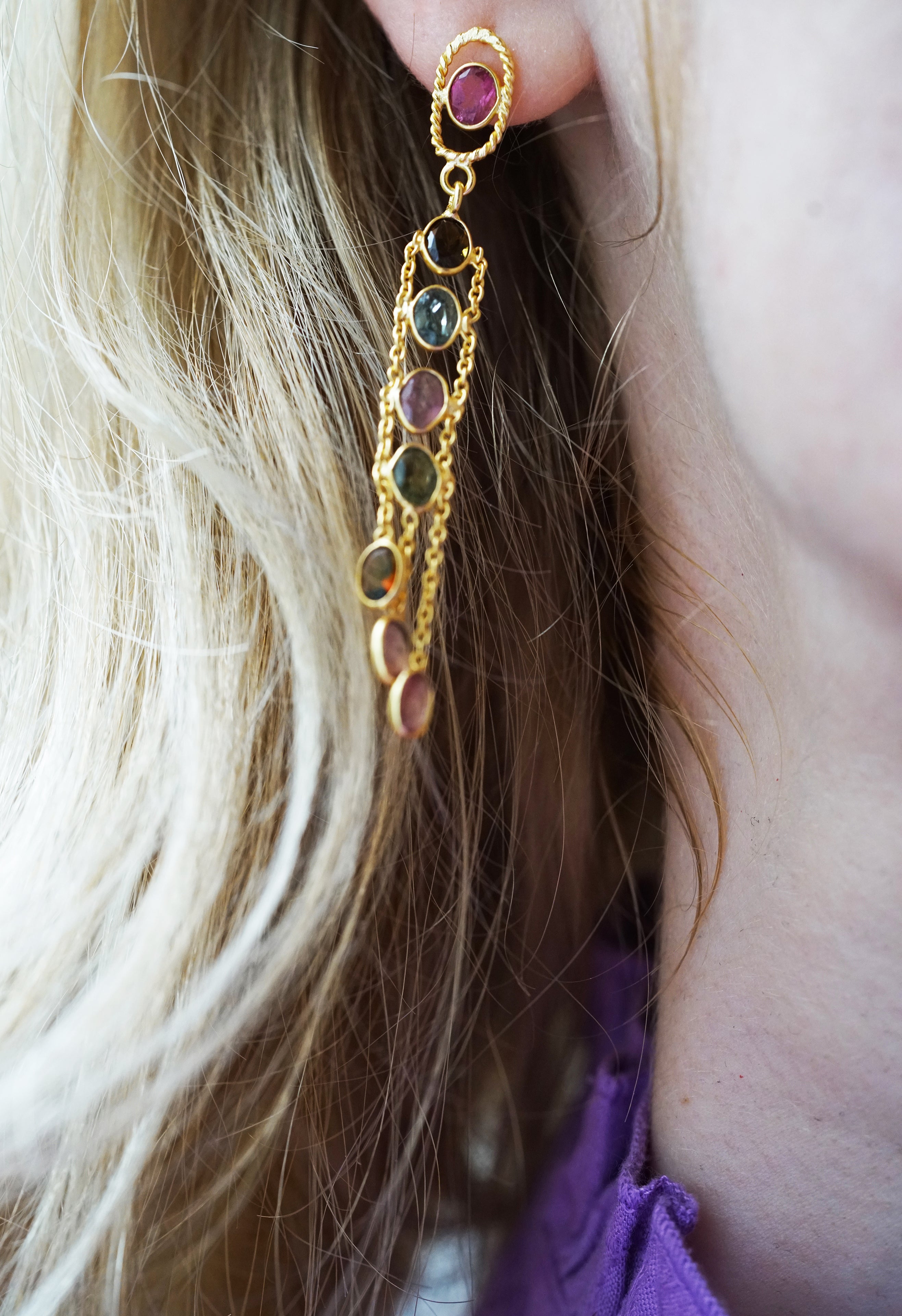 Boucles d'oreilles en laiton plaqué or, ornées de multi tourmalines.