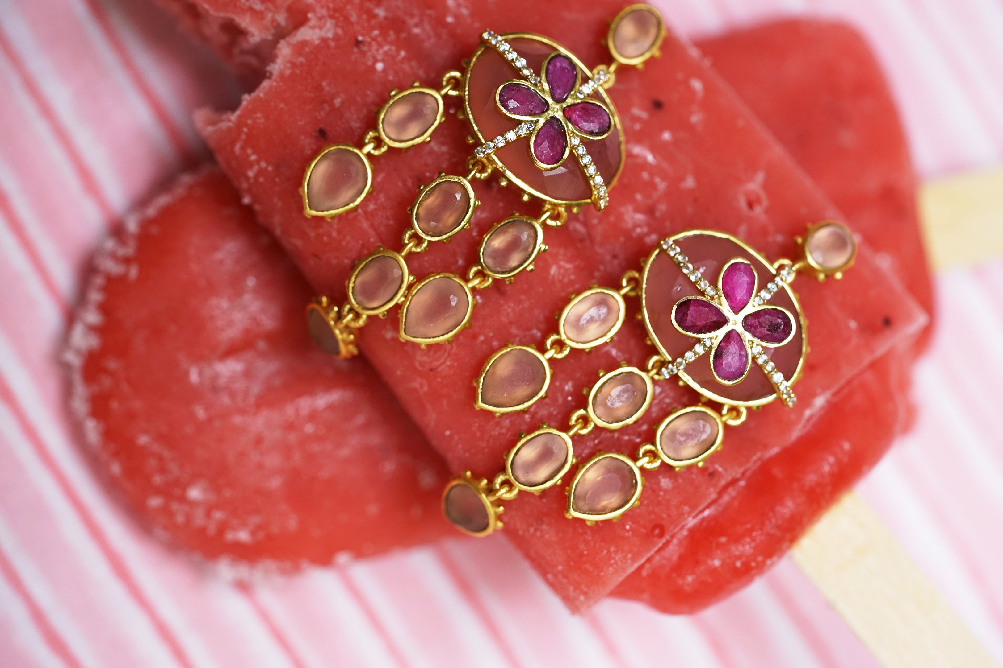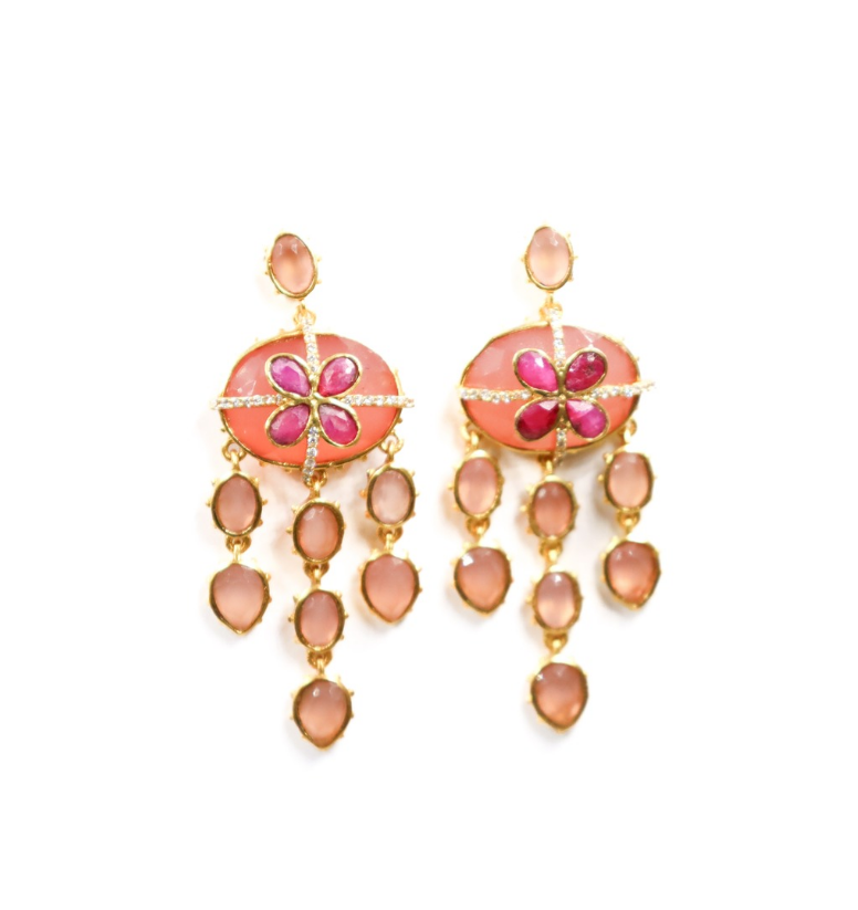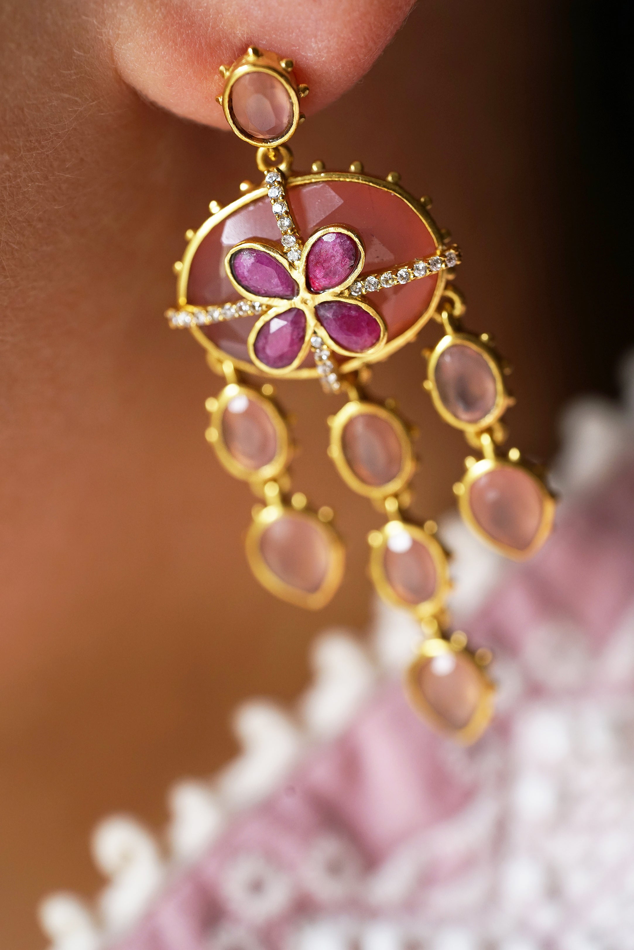 Boucles d'oreilles plaquées or, ornées de quartz rose et rubis.