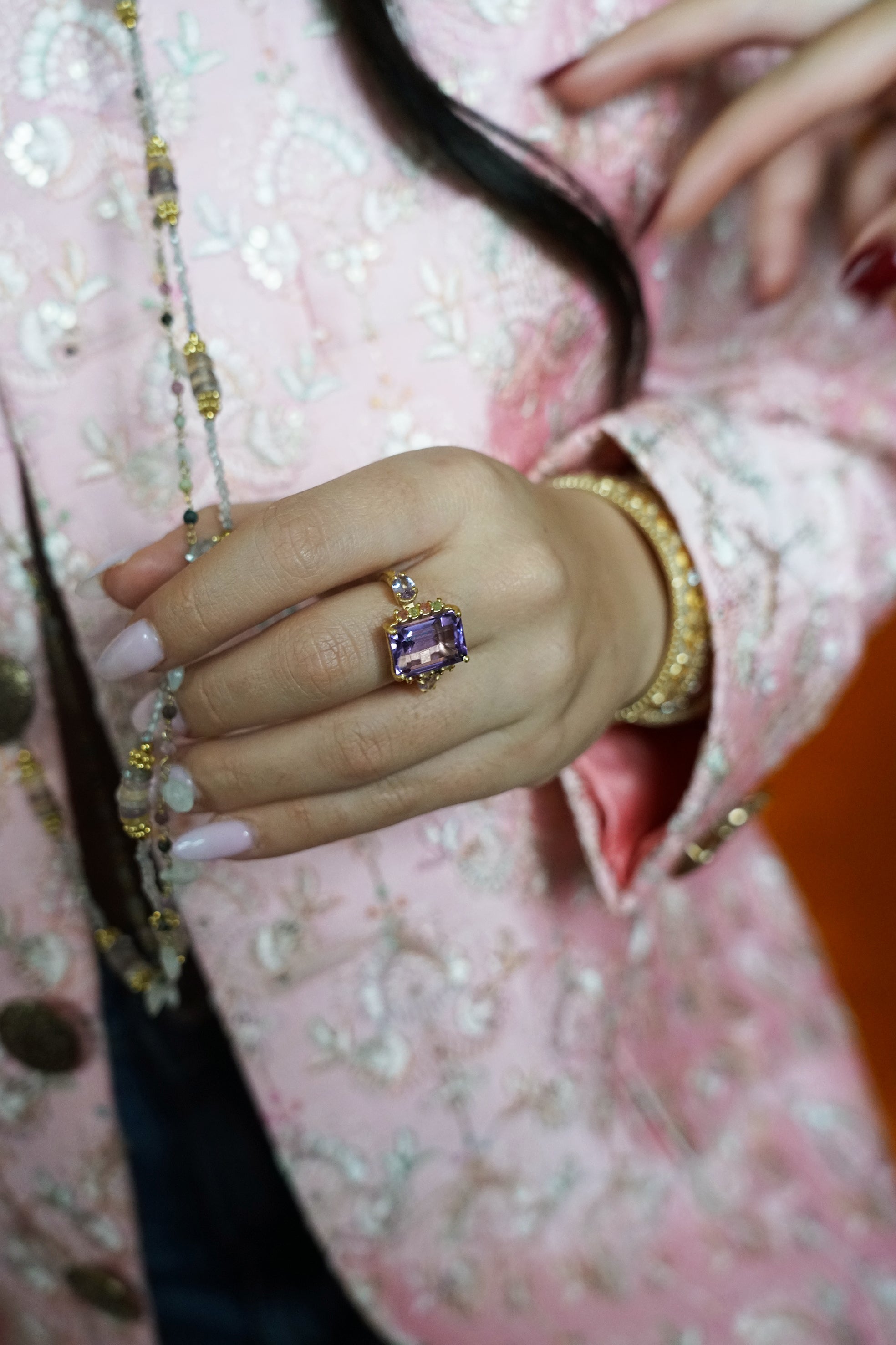 Bague ILIOS en plaqué or, orné d'améthyste et de tourmalines.