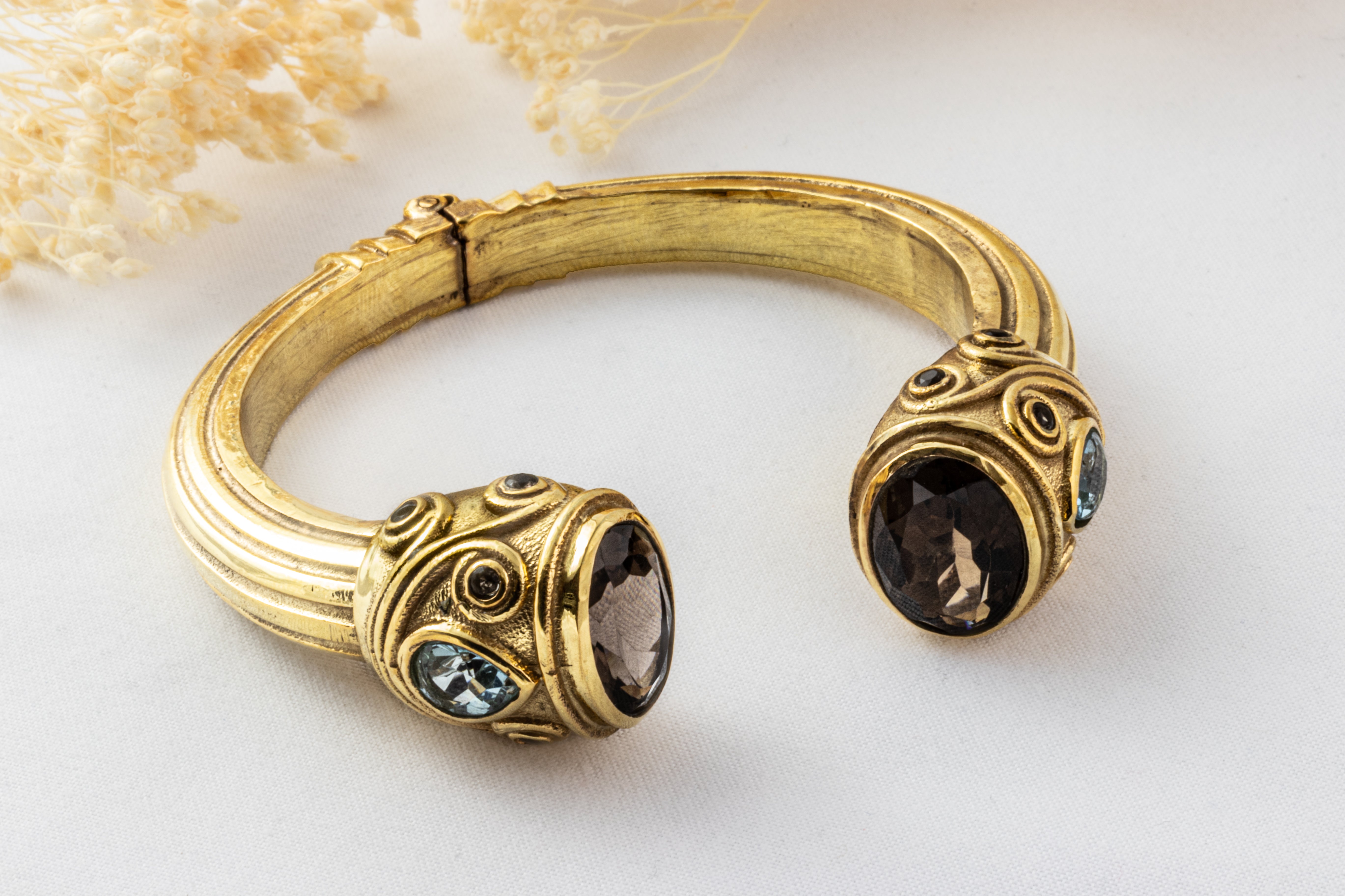 Bracelet laiton plaqué or serti de pierres en quartz fumé et topaze bleue