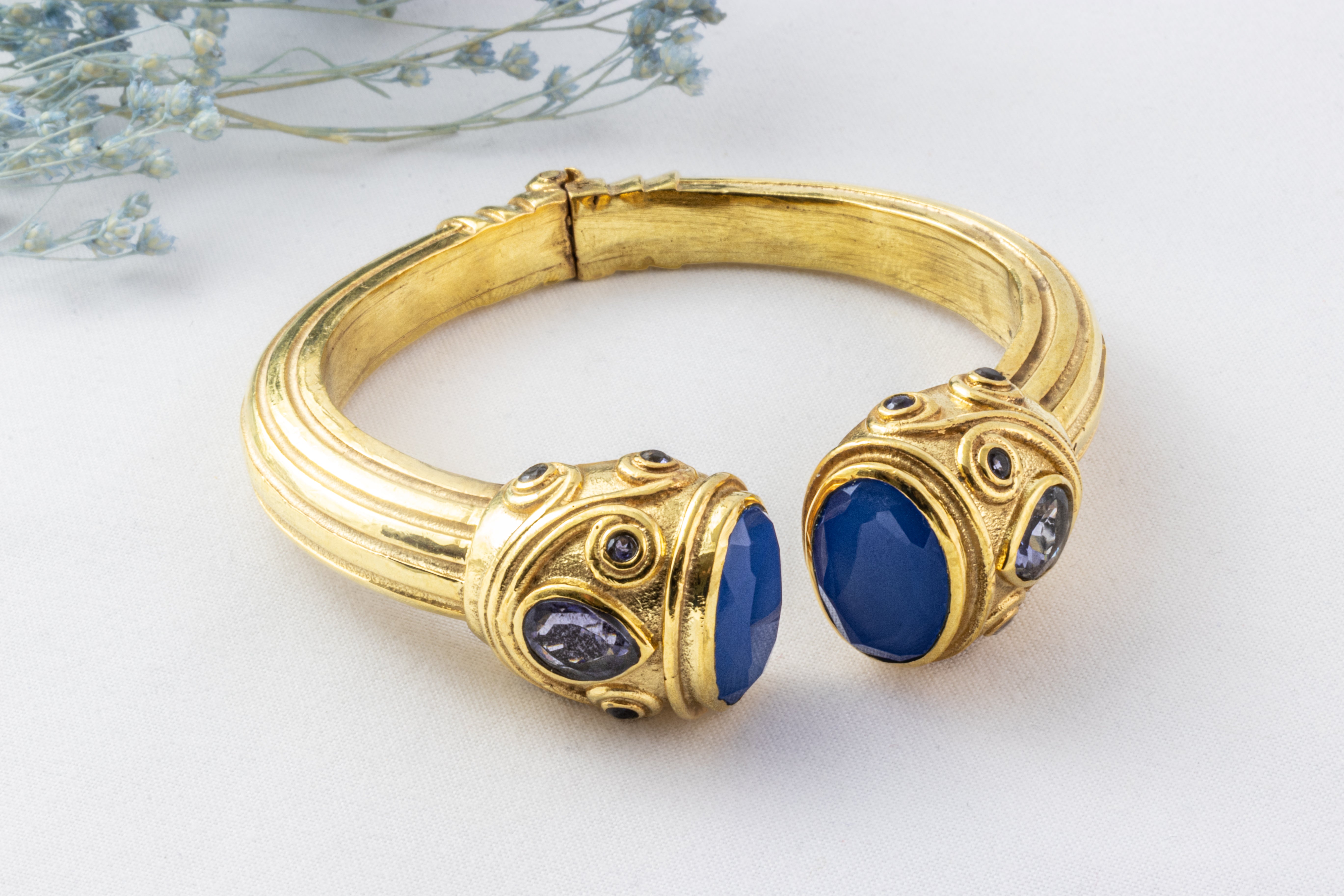 Bracelet laiton plaqué or orné de calcédoines bleues et iolites